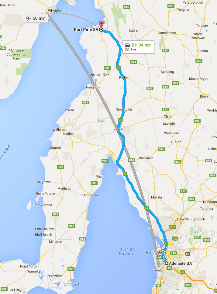 Port Pirie is just off the Port Augusta Highway (A1) around 250 km north of Adelaide, and an hour or so south of Port Augusta. The A1 leaves the coast at Port Wakefield and, with the exception of the salt lakes at Locheil, takes a direct route lacking in attractions. The Copper Coast Highway is an alternate route, hitting a few towns along the.